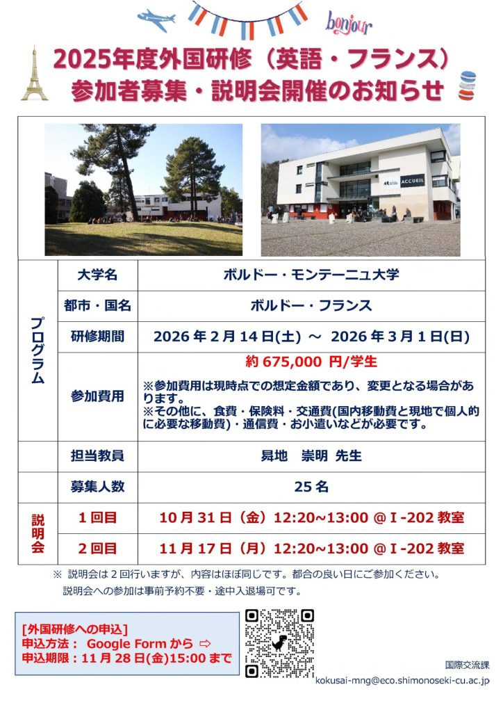 A two-week foreign training program will be held in Bordeaux, France in February 2026 (spring break).