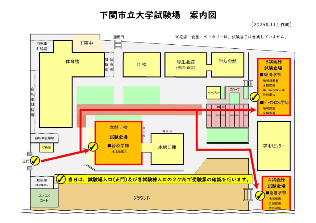 ※There is no parking lot for examinees and a waiting place for pick-up vehicles around the test site and the test site.