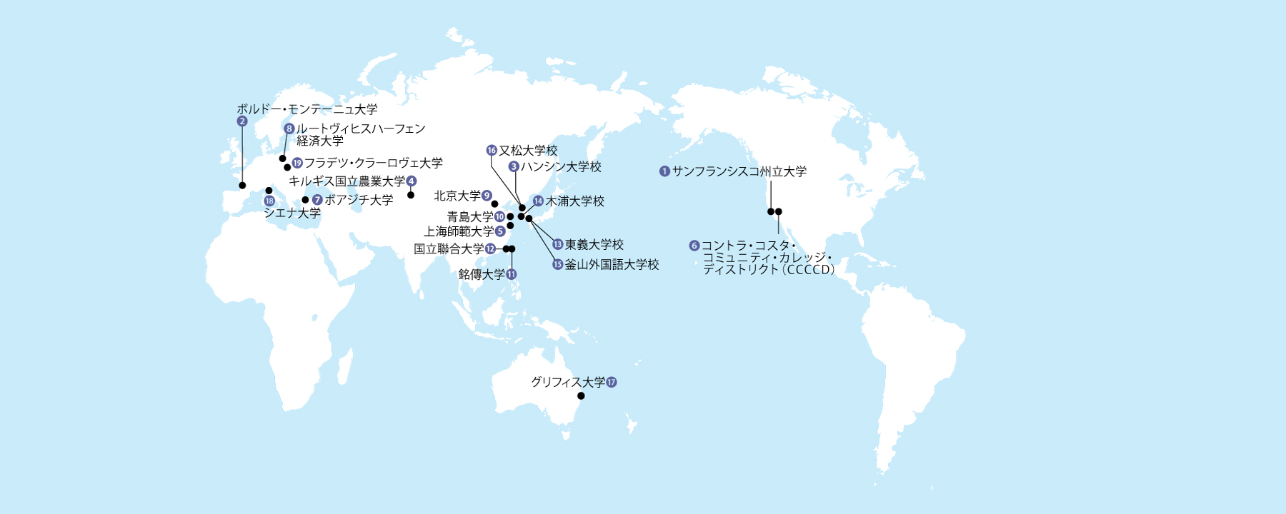 Home International exchange Study Abroad Data Exchange partner schools Study Abroad Data Exchange partner schools ❻ Contra Costa Community College District (CCCCD) Los Medanos College (LMC) Pittsburgh City, USA Diablo Valley College (DVC) Pleasant Hill City, USA Contra Costa College (CCC) San Pablo, USA 1 San Francisco State University United States / San Francisco 2 University of Bordeaux Montaigne France / Pessac 3 Hansin University Korea / Seoul Special City 4 Kyrgyz National Agricultural University Kyrgyzstan / Bishkek City 5 Shanghai Normal University China / Shanghai City 7 Boğaziçi University Turkey / Istanbul City 8 Ludwigshafen University of Business and Society Amlin City, Ludwigshafen, Germany 9 Peking University China / Beijing City 10 Qingdao University Qingdao City, China 11 Ming Chuan University Taiwan / Taipei City 12 National United University Naeguri City, Taiwan 13 Dong-eui University South Korea / Busan Metropolitan City 14 Mokpo National University South Korea/Muan County 15 Busan University of Foreign Studies South Korea / Busan Metropolitan City 16 Woosong University Korea / Daejeon Metropolitan City 17 Griffith University City of Brisbane, Australia 18 University of Siena City of Siena, Italy 19 Fradez Klarove University Czech Republic / Fradez Kralove City