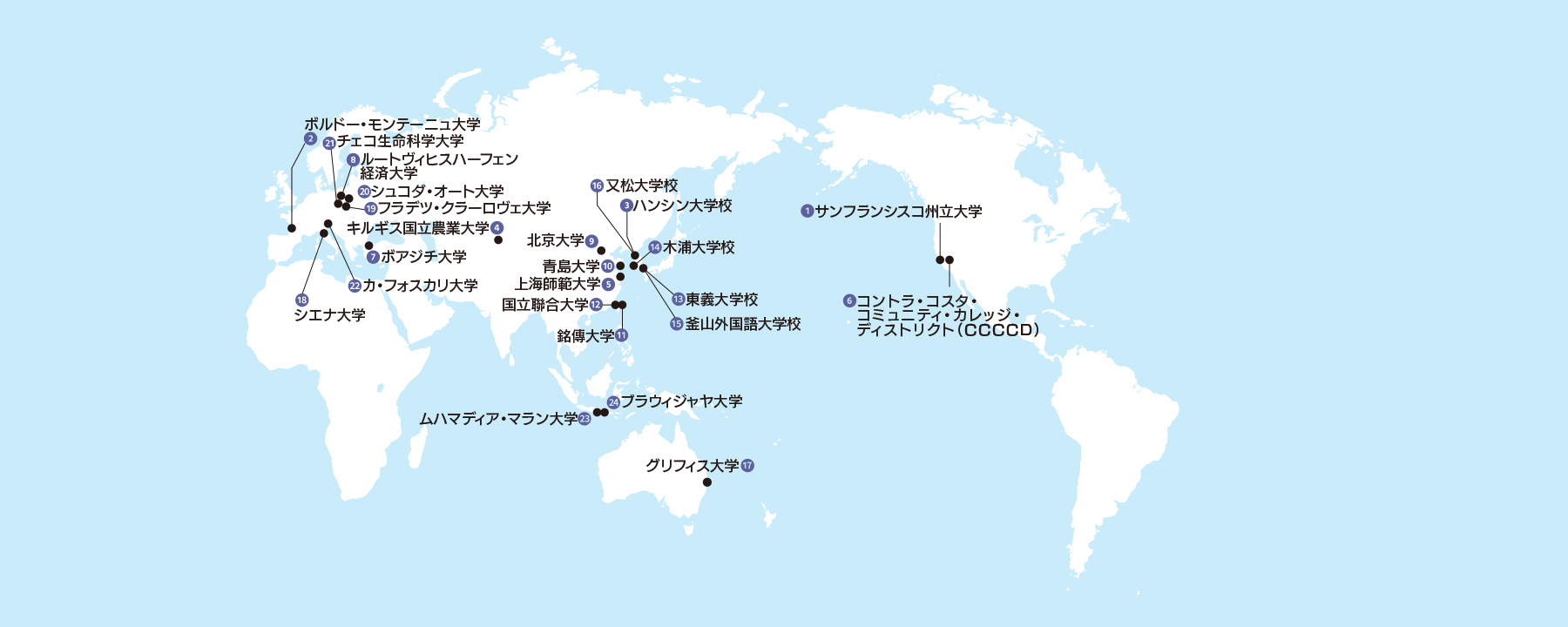 Home International exchange Study Abroad Data Exchange partner schools Study Abroad Data Exchange partner schools ❻ Contra Costa Community College District (CCCCD) Los Medanos College (LMC) Pittsburgh City, USA Diablo Valley College (DVC) Pleasant Hill City, USA Contra Costa College (CCC) San Pablo, USA 1 San Francisco State University United States / San Francisco 2 University of Bordeaux Montaigne France / Pessac 3 Hansin University Korea / Seoul Special City 4 Kyrgyz National Agricultural University Kyrgyzstan / Bishkek City 5 Shanghai Normal University China / Shanghai City 7 Boğaziçi University Turkey / Istanbul City 8 Ludwigshafen University of Business and Society Amlin City, Ludwigshafen, Germany 9 Peking University China / Beijing City 10 Qingdao University Qingdao City, China 11 Ming Chuan University Taiwan / Taipei City 12 National United University Naeguri City, Taiwan 13 Dong-eui University South Korea / Busan Metropolitan City 14 Mokpo National University South Korea/Muan County 15 Busan University of Foreign Studies South Korea / Busan Metropolitan City 16 Woosong University Korea / Daejeon Metropolitan City 17 Griffith University City of Brisbane, Australia 18 University of Siena City of Siena, Italy 19 Fradez Klarove University Czech Republic / Fradez Kralove City 20 Schkoda Auto University Czech Republic / Murada Boleslav City 21 Czech University of Life Sciences Czech Republic / Prague City 22 Ka Foscari University City of Venice, Italy 23 Muhammadia Malang University Malang City, Indonesia 24 University of Brawi Djajaja Malang City, Indonesia