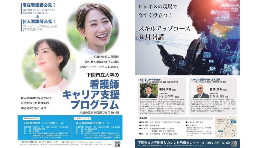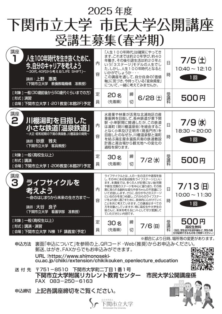 Home About Shimonoseki City University List of New Information SDGs Initiatives for SDGs SDGs Home Initiatives for SDGs SDGs Activity Contact Form Education "Conclusion of an agreement on industry-academia collaboration education and research between seven companies and Shimonoseki City University" and "Implementation of joint research with Monobanku and Shimonoseki City University" 2025.07.24 About the Current Status of Cultural Properties of Japan Heritage by TUFS Students 2025.05.29 [Recruitment of students] Recurrent Education Center 2025 Shimonoseki City University Open Lecture (Spring semester) 2025.05.28 Faculty of Nursing Campus Tour was held 2025.05.26 List of lectures on business trips [2025 edition] has been posted. 2025.05.20 Understanding and supporting children with attachment disabilities: Based on the relationship between attachment and developmental disabilities 2025.04.25 Faculty of Nursing Campus Tour (May 11) 2025.04.22 [Recruitment of students] We are looking for a 2025 certification program and a skill improvement course. 2025.03.31 [Extended application period] We will extend the recruitment period for the 2025 Ryokan Management Expert Training Course, whales and whaling regional revitalization skills improvement course 2025.03.07 The completion ceremony of Shimonoseki City University Faculty of Nursing Building (N Building) was held, and the commemorative lecture and preview of Shimonoseki City University Faculty of Nursing was held. 2025.03.06 Shimonoseki City University Faculty of Nursing Opening Lecture and Public View 2025.02.21 The 2nd Leadership Training was held in FY2024. 2025.02.12 2 / 3«123»