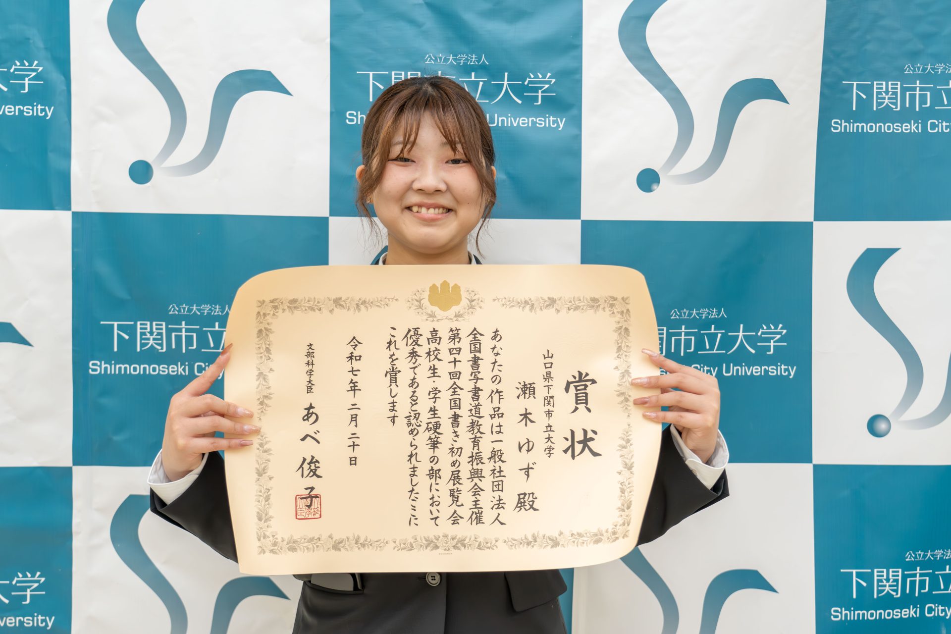 Yuzu Segi, a 3rd year student at Department of Economics Faculty of Economics, received a special award from the Minister of Education, Culture, Sports, Science and Technology from Monday, March 24 to March 31 (Mon). In honor of this honor, Shimonoseki City University Chair Award was awarded.